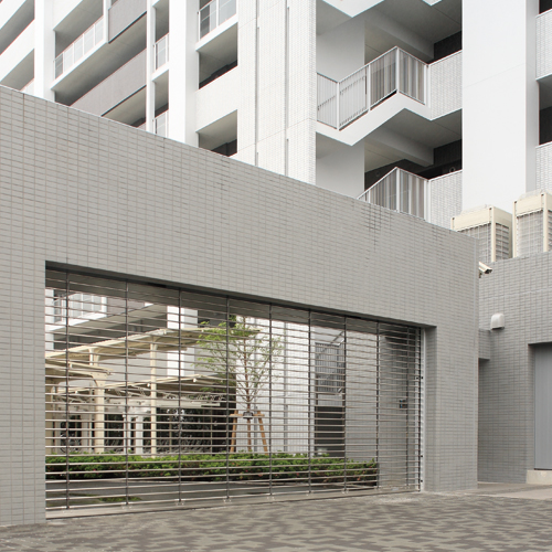 マンションの駐車場出入り口の管理用シャッターとして、お待たせしない「高速開閉」、利用車が多く開閉頻度に対応する「高頻度」、建物に伝わる振動を抑えた「低振動」、という機能を追求したグリルシャッターです。