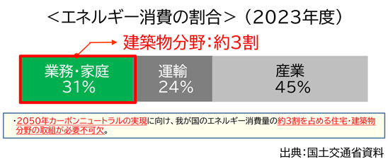 そうした中で、現在、各産業においてカーボンニュートラル(温室効果ガス排出量の実質ゼロ)の実現が求められています。日本では2050年までのカーボンニュートラルを目標に掲げ、2030年までに温室効果ガスを46%削減するという中間目標も設定されています。特に建築物分野は、空調や設備使用で日本のエネルギー消費量の約3割を占めるといわれ、建設業界全体でCO₂削減が迫られています。