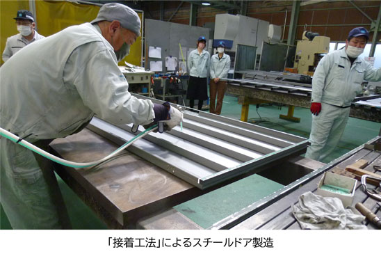 従来の工法:鋼製・ステンレス製建具(ドア・窓)の製造は、古くから溶接組立で行われ、ねじによる組立や構造用両面テープなども活用されています。その一方で、接着剤が使われるケースもありましたが、これは各メーカーが独自に民間工事向けとして採用・運用していたものでした。