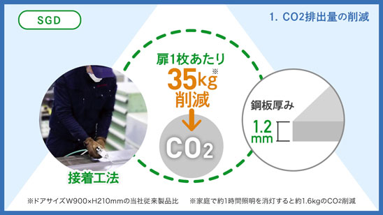 文化シヤッターでは、「接着工法」を用いて製造する環境配慮型スチールドア「SGD」を製造しています。「接着工法」は溶接や研磨不要のため、ドアの表面を傷めず、長寿命化が図れます。さらにドアの表面材に用いる鋼板の薄板化がもたらす軽量化も実現しています。このようにスチールドア「SGD」は、「接着工法」と「軽量化」により、環境負荷低減や作業環境の向上だけでなく、運搬時の負荷低減、使用者の操作性、使い勝手向上など、さまざまなメリットをもたらします。