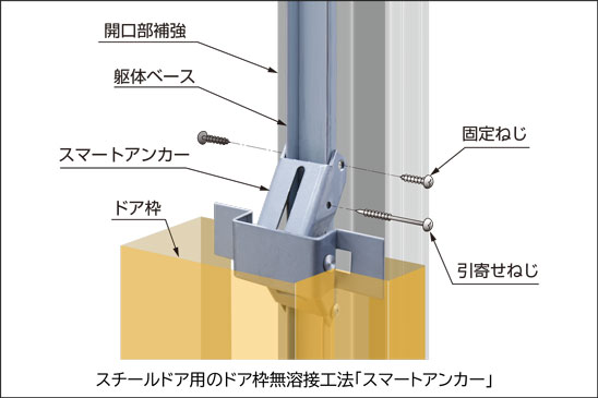 また、ドア枠の施工には溶接作業を行わない「スマートアンカー」を用いた「無火気工法」で設置します。「スマートアンカー」はJIS A 4702に規定されている各種性能試験で、溶接と同等の強度を確認しています。