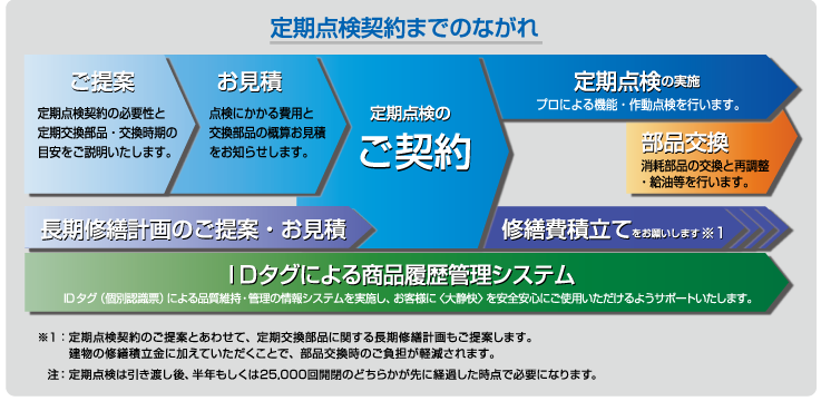 定期点検契約を結んでいただきますと、定期的に製品の機能・性能を維持するための診断を行います。その結果に基づき、必要に応じて整備を行います。定期点検をすることで不具合の発生時期をある程度予測することが可能となり、調整や部品交換等の処置を施すことで製品故障により開閉ができなくなる事や、故障したまま使用を続けることにより他の部品にダメージを与えてしまうといった心配が軽減されます。