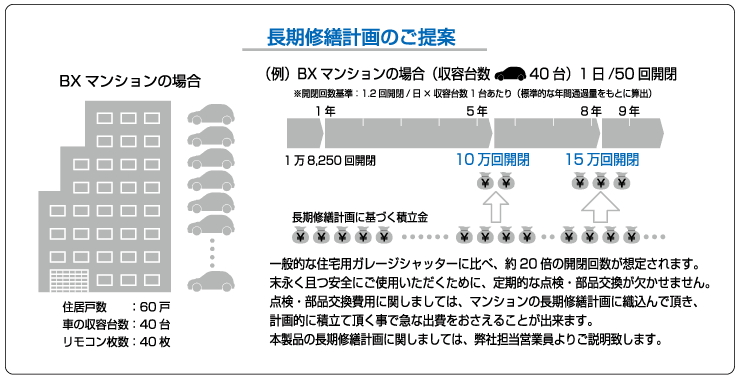 車両台数が目安として80台以上の場合、開閉頻度が高くなるため早期に部品交換が必要な開閉回数に到達します。そのため、車両の出入り口を2箇所設けて頂いたり、開閉タイマー(オプション)を使用して利用頻度の高い時間帯はシャッターを開放しておいたりすることをご検討ください。