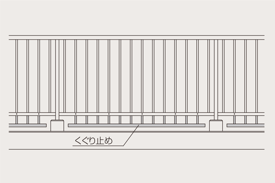 階段の踏み面納まり、屋上の根巻コンクリート納まり、このような場合にくぐり止めを取り付け、躯体と手すりの隙間を小さくします。転落などの事故をなくすため補助として使用します。