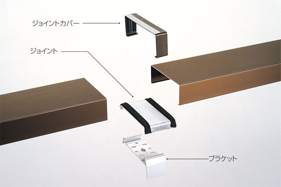 笠木のジョイント部分は「ジョイント」と「ブラケット」を一体化したジョイントブラケット構造です。レベル調整が容易で施工性が良く、また「ジョイントカバー」の併用で防水性とデザイン性を両立しています。