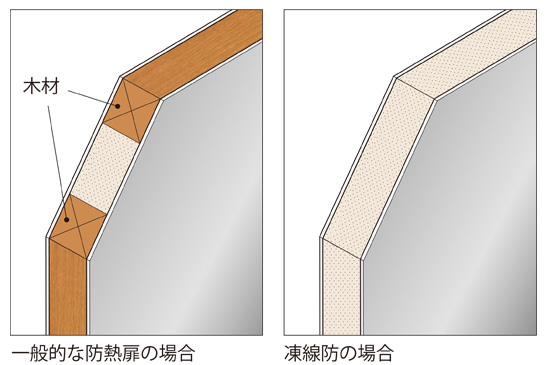 扉四方の木材補強をなくし、発泡ウレタンの接着力で扉本体の強度を維持し、扉の軽量化を実現しました。木材を使用していないため、毎日の清掃・洗浄による内部木材の腐敗や雑菌の繁殖を防ぎます。